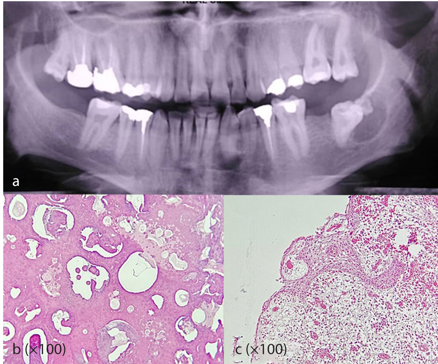 Figure 1. Dentigerous cyst/odontoma; a: The panoramic radiograph shows a well-defined corticated unilocular radiolucent lesion with radio-opaque mass around the crown of a semi-impacted left mandibular third molar; To prepare the sample, we had to separate the calcified part (odontoma) and put it in acid; thus, the images of the different parts of the lesion can be observed in two separate slides as follows, b: The microscopic section displays complex odontoma (Hematoxylin and eosin staining, 100×), c: Lining of the dentigerous cyst with nonkeratinized stratified squamous epithelium (Hematoxylin and eosin staining, 400×)