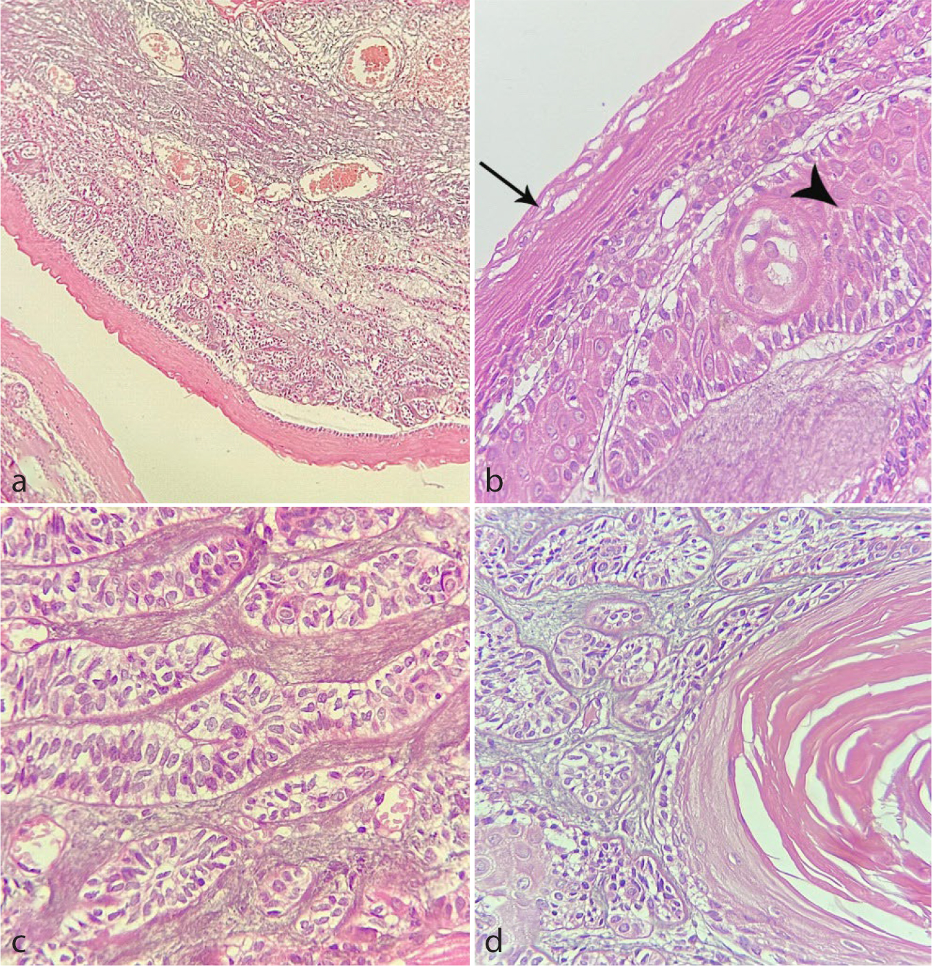 D: Complex histology which is composed of epithelial follicles packed with parakeratin/orthokeratin and keratin masses extruded into connective tissue stroma in the form of Pacinian-like stacks with or without foreign body response. Therefore, the microscopic appearance of the present case (Figure 2) is similar to the case described by Neuman et al. [ 7 ], which showed a superficial OKC with palisading basal cell layer, corrugated surface, and islands of ameloblastoma in the underlying connective tissue showing reverse polarity and apical vacuolization.