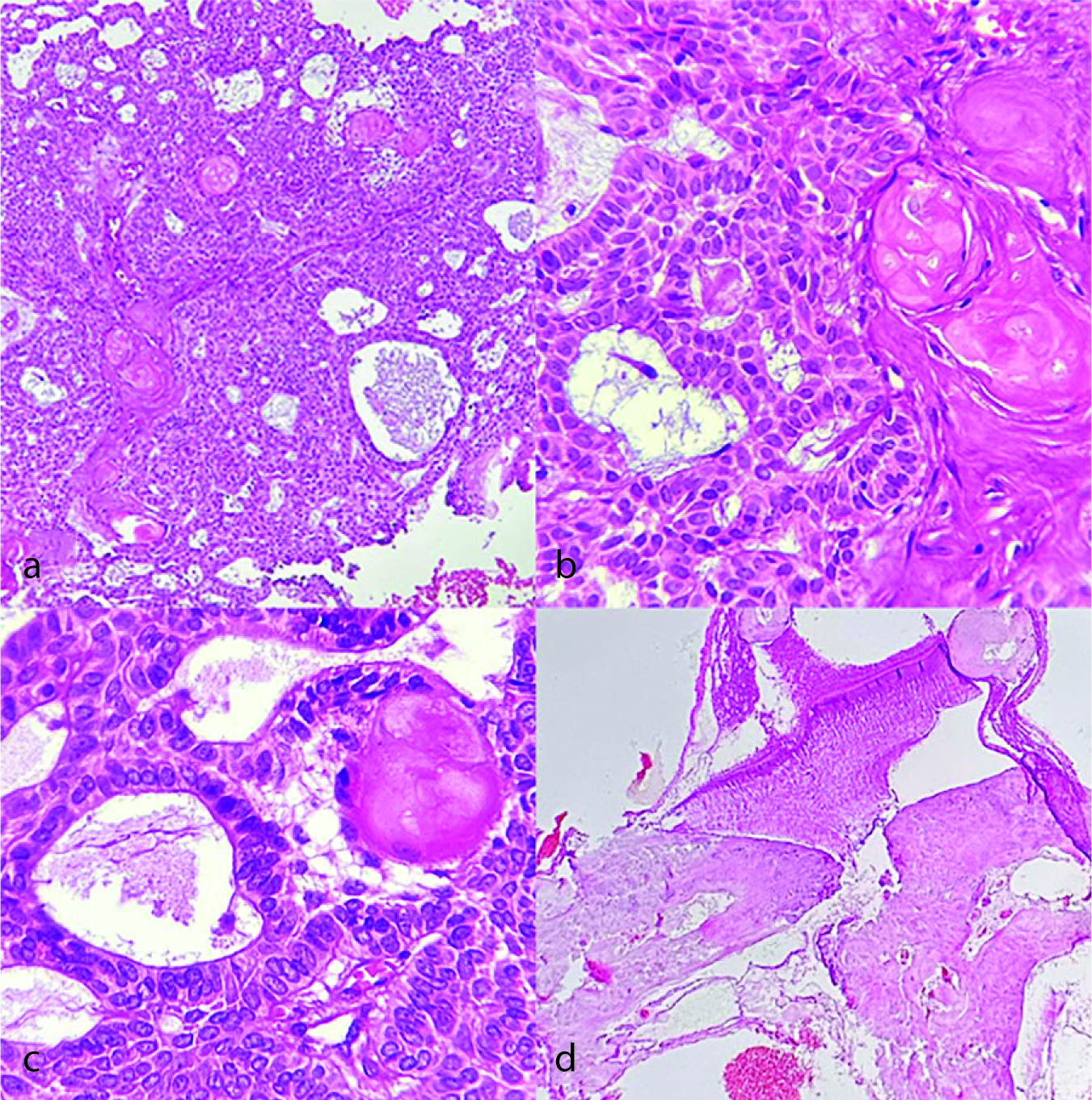 Figure 4. Histopathologic sections of adenomatoid odontogenic tumor with excessive ghost cells/odontoma, a-b: Many duct-like structures and ghost cells (Hematoxylin and eosin staining, 100×), c: Same image with higher magnification (Hematoxylin and eosin staining, 400×), d: The odontoma part (Hematoxylin and eosin staining, 100×)