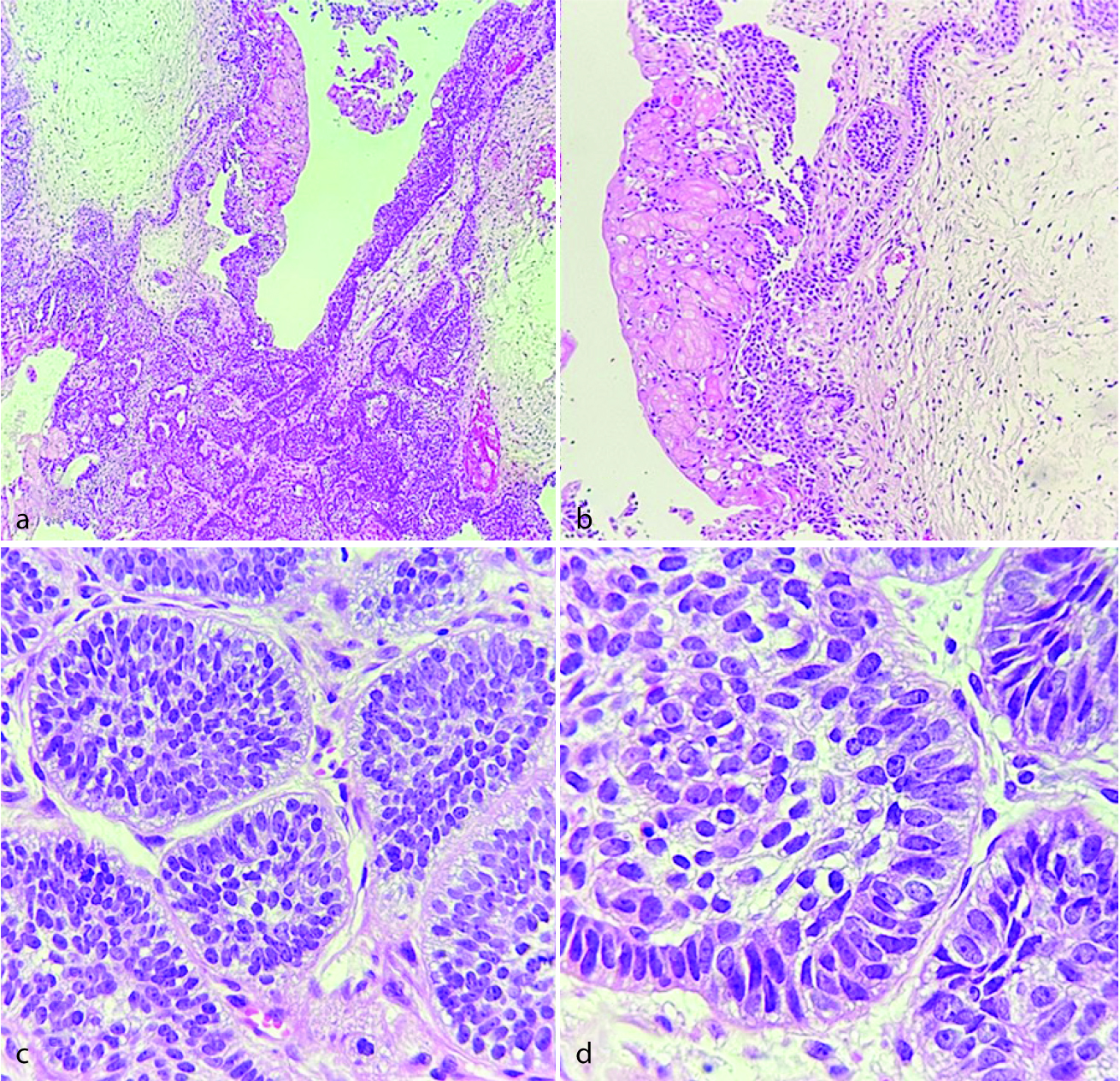 Figure 3. Histopathologic sections of glandular odontogenic cyst/ameloblastoma, a: A cystic lesion lined by hyperplastic stratified squamous epithelium containing numerous mucous cells (Hematoxylin and eosin staining, 100×), b: The surface hobnail appearance (Hematoxylin and eosin staining, 400×), c: A duct-like space (Hematoxylin and eosin staining, 400×), d: The ameloblastic proliferation (Hematoxylin and eosin staining, 100×)