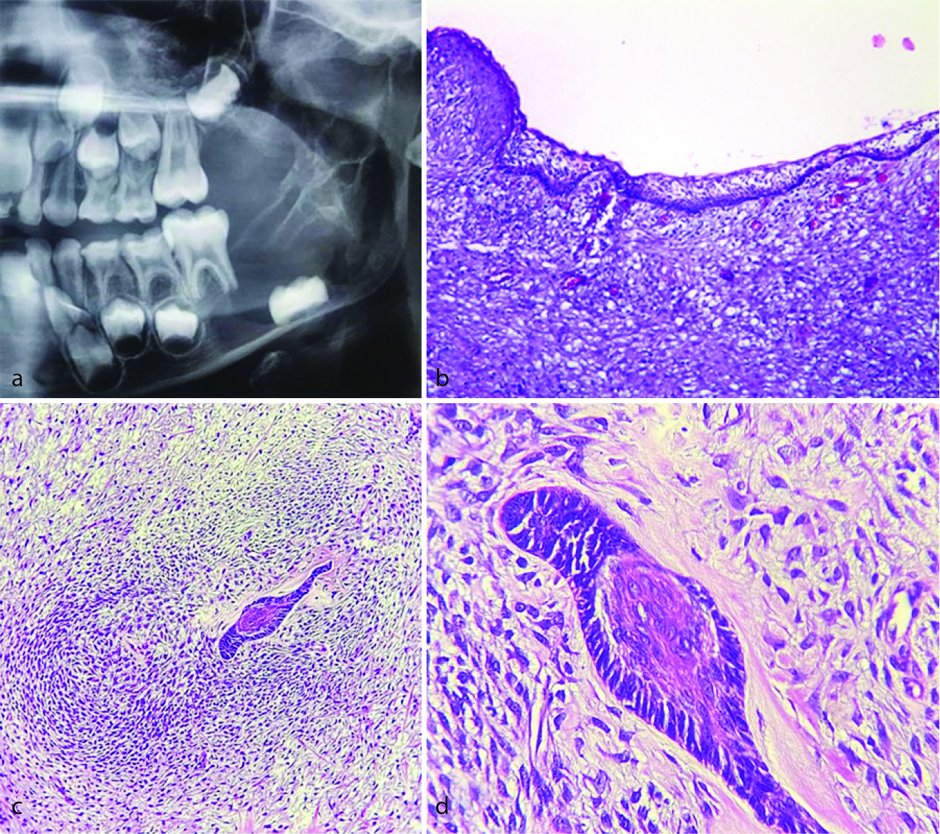 Figure 6. Radiographic view and histopathologic sections of ameloblastic fibroma/unicystic ameloblastoma, a: The panoramic radiograph reveals a well-defined corticated multilocular radiolucent lesion which involves the newly formed mandibular left second molar tooth bud, b: A cystic lesion lined by ameloblastic epithelium (Hematoxylin and eosin staining, 100×), c-d: The underlying connective tissue demonstrates dental papilla-like stroma containing scattered ameloblastic islands (Hematoxylin and eosin staining, at magnification of 100× and 400×; respectively)