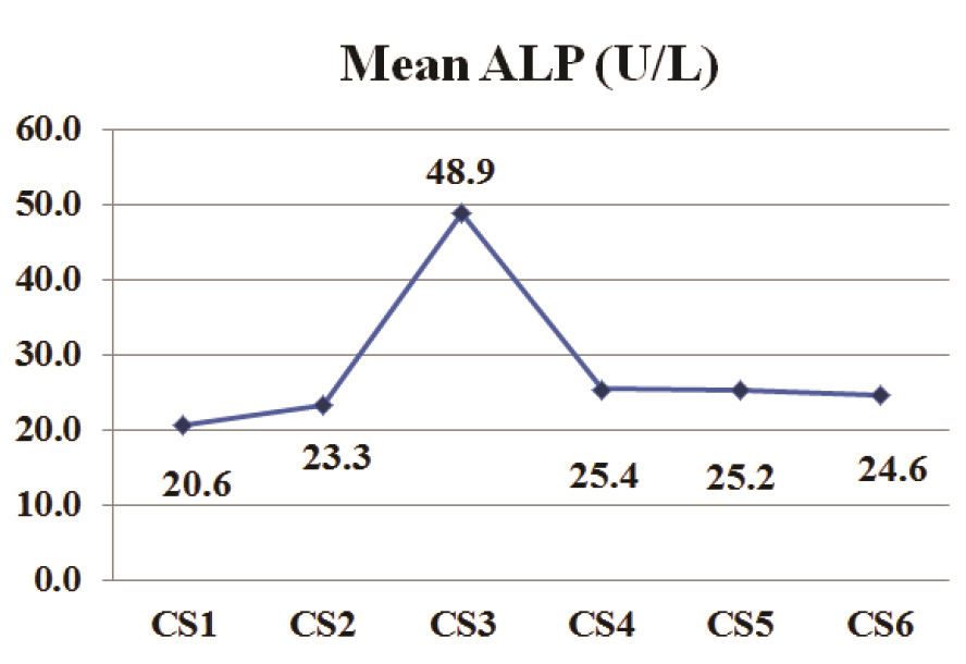 Figure 1. ALP pattern in the circumpubertal period, ALP: alkaline phosphatase, CS1-CS6: cervical stage 1 through cervical stage 6, U/L: Units per Liter