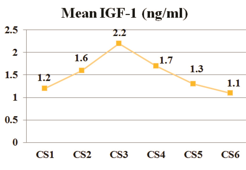 ALP: Alkaline phosphatase, CS1-CS6: Cervical stage 1 through cervical stage 6, IGF-1: insulin like growth factor-1, ng/ml : nanograms per milliliter, U/L: units per liter * p Value< 0.05 considered significant |