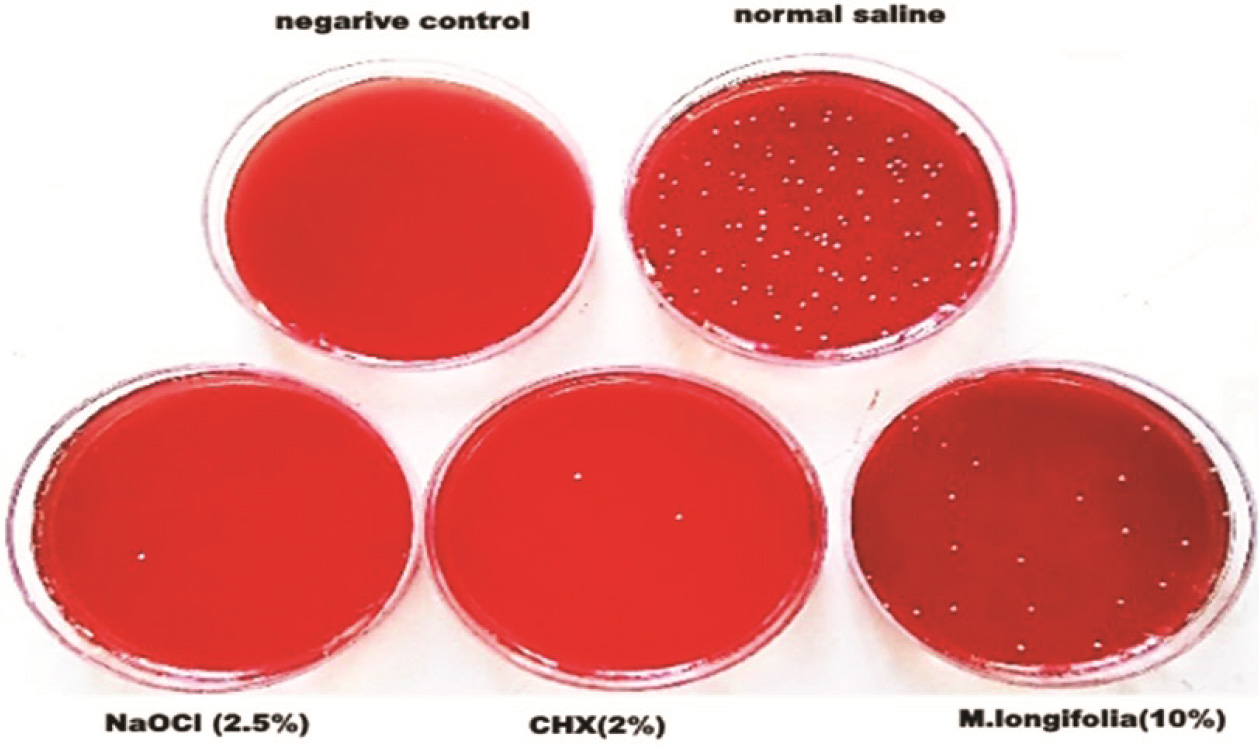 The study groups were categorized into the following groups; Group 1: Normal saline (Negative control) without bacteria ( in other groups, we cultured the canals with E. faecalis and irrigated them with the introduced substances), Group 2: Normal saline, Group 3: 2.5% NaOCl, Group 4: 2% CHX, and Group 5: M. longifolia essential oil solution based on MIC.